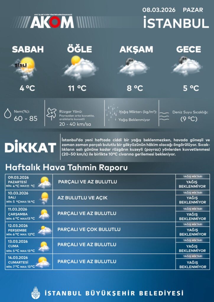 İstanbul Büyükşehir Belediyesi Afet Koordinasyon Merkezi (AKOM)’nden İstanbullulara uyarı geldi. İstanbul’da haftalık hava tahmin raporunu göre, yeni haftada önemli bir […]